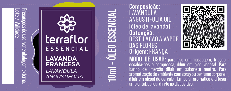 Alivia tensões e desconfortos dos músculos, pode ser usado em óleos de massagem relaxantes para cólicas e cãibras. Adicionar 15 gotas de óleo essencial de Lavanda Francesa em 30ml de óleo vegetal de Girassol Orgânico Terra Flor. FLFricção Local (FL)